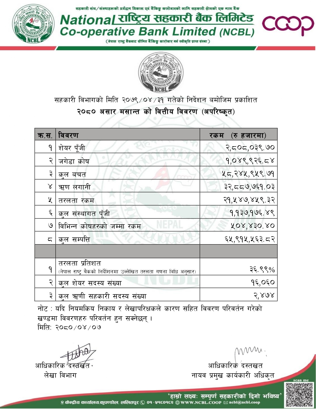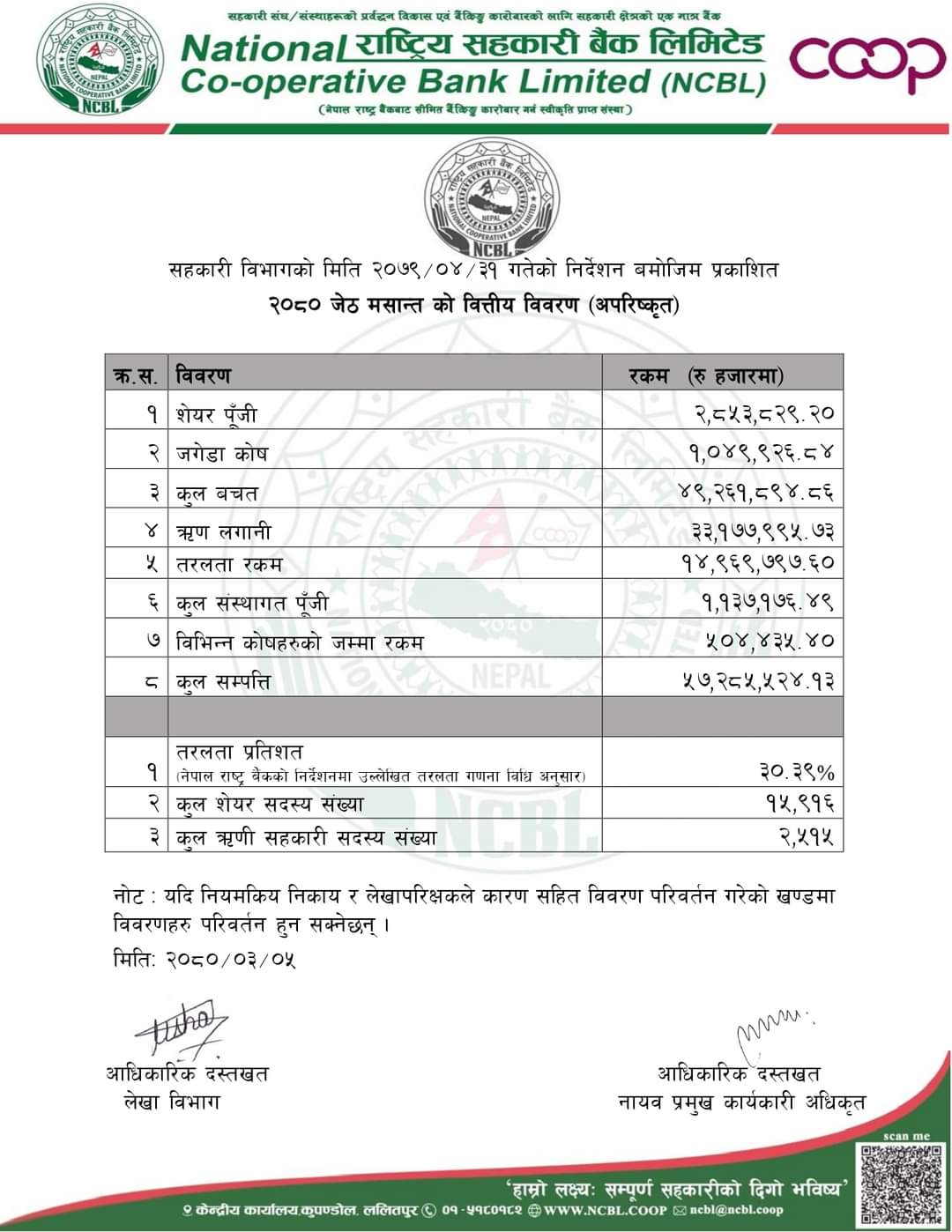 Financial Statement for the Month of Jestha 2080 (Unaudited)