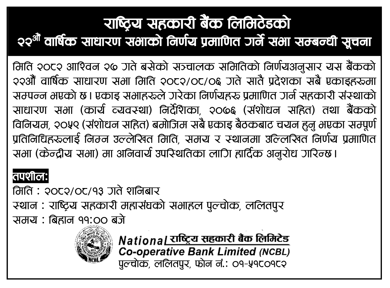 २२औं वार्षिक साधारण सभाको निर्णय प्रमाणित गर्ने सभा सम्बन्धी सूचना