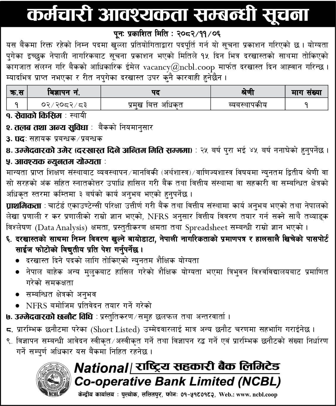 Re-Vacancy notice for the position of CFO 2082-11-06
